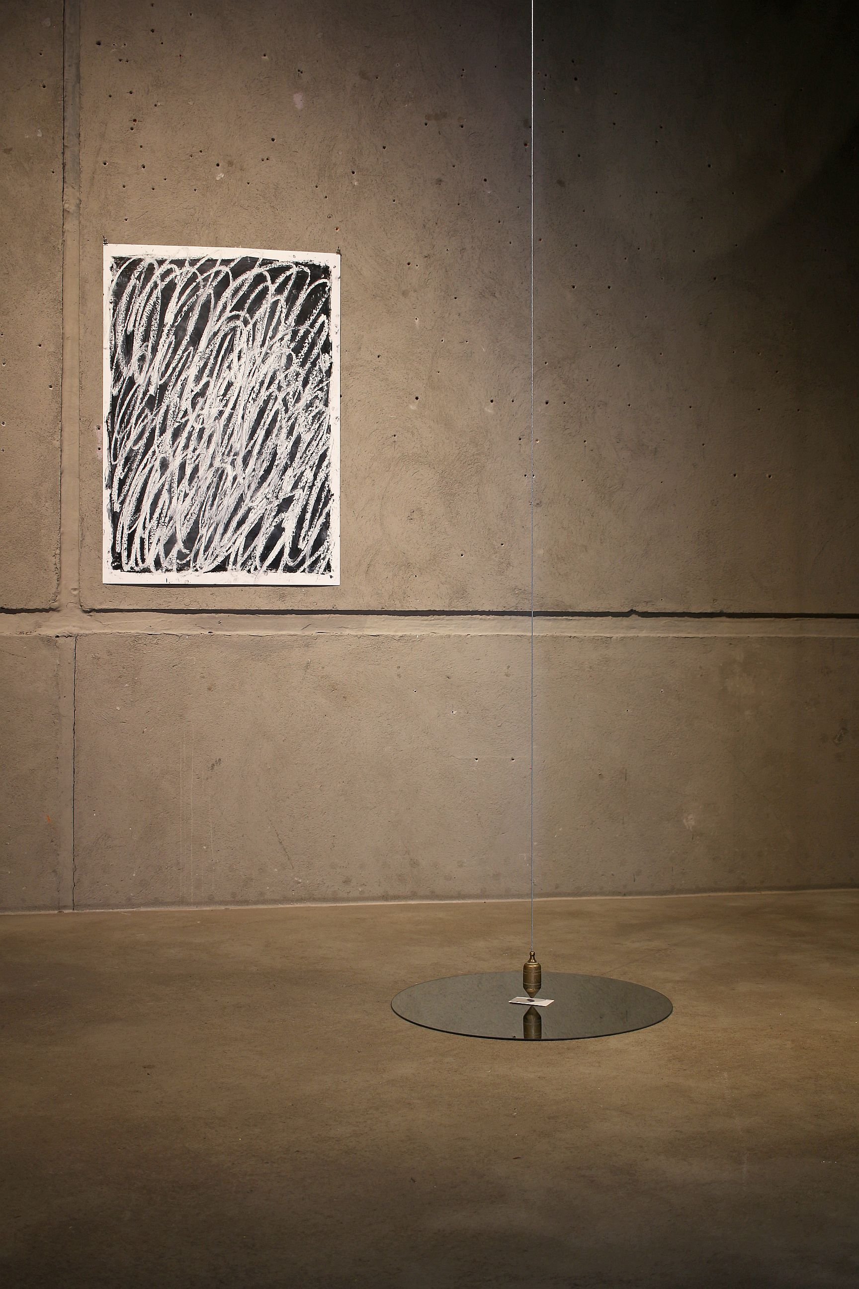 A mnemonic phrase used in Italy to memorize the hierarchy of the pokercard symbols, Cuori Quadri Fiori Picche which is Hearts Diamonds Clubs and Spades, providing the title to Sebastian Lettner's sculptural installation. Poker comes to mind while you are looking down at the „well“ and your own reflection underneath a pendulum which points on a single card, the Ace Diamond; always useful if you have it up your sleeve, as they say. But what are we gambling for here and what's the stake of the game? A sword of Damocles swinging above our own faces? It's the spectator that decides how much swing he wants to give to the installation, activating the space, raising questions about time and chance.